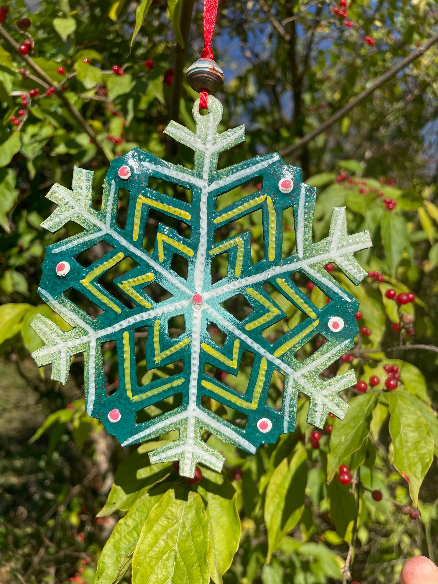 Handmade from a steel drum in Port-au-Prince, Haiti. Features a 5¼" brightly painted snowflake with green as the dominant color.